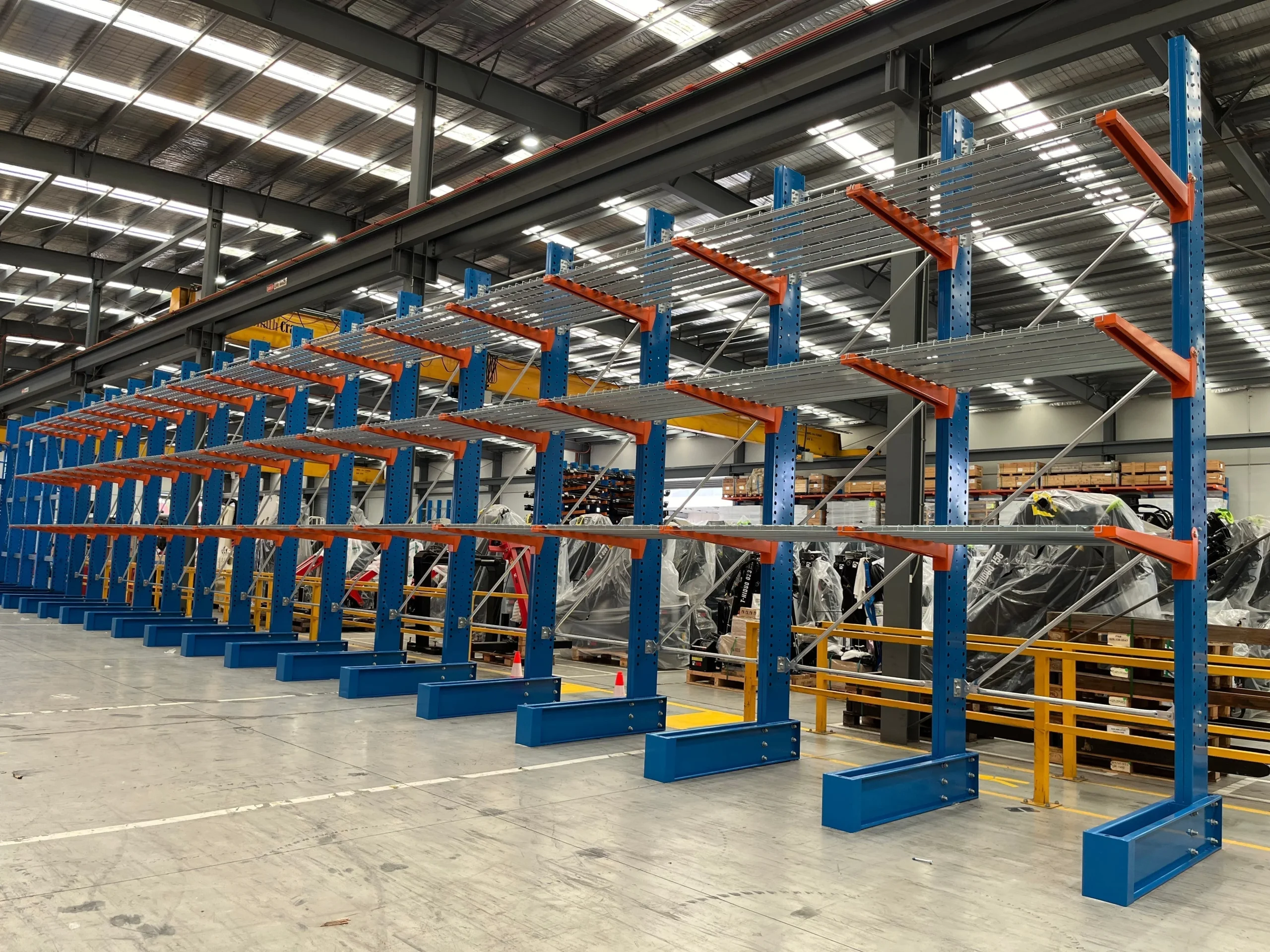 Cantilever racking is designed for long, irregular, or oversized items such as pipes, timber, and steel sections, offering open-front access and flexible arm configurations.